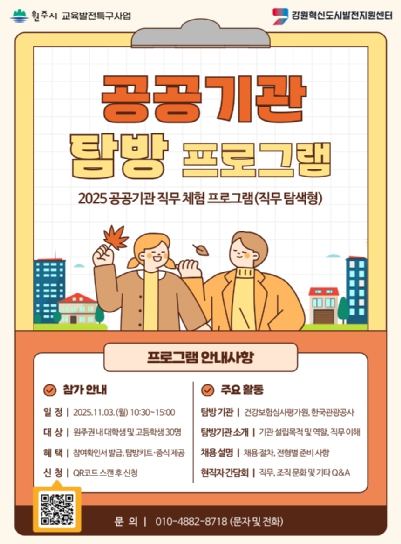 [파이낸셜경제=조성환 기자] (재)강원혁신도시발전지원센터는 원주시 교육발전특구 사업의 일환으로, 오는 11월 3일 원주권 내 청년들의 공공기관 진로 탐색 지원하기 위한 ‘2025 공공기관 직무 체험 프로그램(직무 탐색형)_공공기관 탐방’을 운영한다.