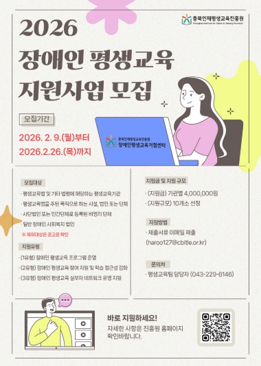 [파이낸셜경제=김기보 기자] 충북인재평생교육진흥원(원장 유태종)은 2026년 장애인 평생교육 지원사업에 참여할 도내 기관·단체를 공개 모집한다.