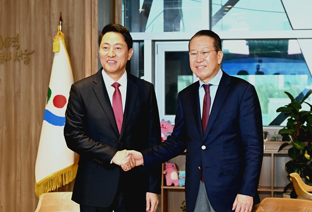 | ▲ 오세훈 서울시장이 6일 오전 서울시청 집무실에서 권영세 국회의원(오른쪽)과 악수하고 있다. |