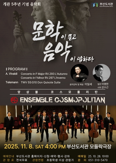 [파이낸셜경제=박영진 기자] 부산도서관 개관 5주년 기념음악회 '문학이 묻고 음악이 답하다'에 참여하여 깊어가는 가을 아름다운 음악으로 가슴 따뜻한 추억을 만들어 보세요!