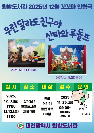 [파이낸셜경제=김영란 기자] 한밭도서관은 지역 어린이들에게 따뜻한 감성과 사회적 가치를 전하기 위해 두 가지 인형극 ‘우린 달라도 친구야’, ‘산타와 루돌프’를 공연한다.