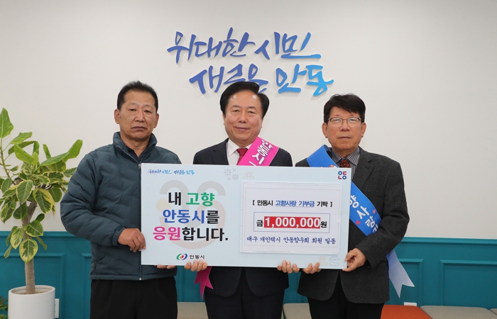 [파이낸셜경제=김지훈 기자] 대구개인택시 안동향우회가 지난 28일 안동시청을 방문해 고향사랑기부금 100만 원을 기탁했다. 이번 기부는 2023년과 2024년에 이어 3년 연속 이어진 뜻깊은 나눔이다.