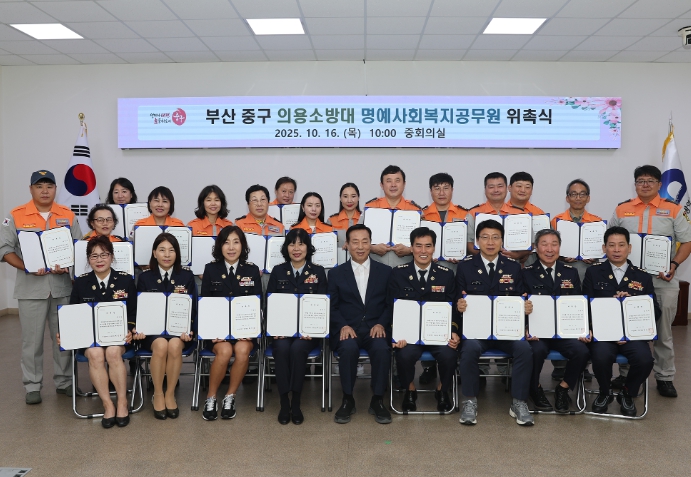 [파이낸셜경제=박영진 기자] 부산 중구는 지난 16일 중부소방서 의용소방대원 54명을 중구 명예사회복지공무원으로 위촉하는 행사를 개최했고, 중부소방서 의용소방대 본대 이봉석 남성대장, 심경란 여성대장등이 참석했다.