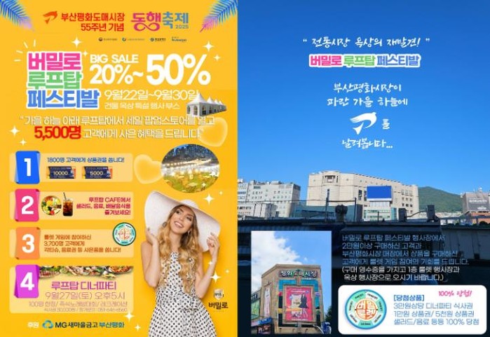 [파이낸셜경제=박영진 기자] 부산진구는 부산평화시장 번영회 주최로 개점 55주년 기념 ‘버밀로 루프탑 페스티벌’을 9월 22일부터 9월 30일까지 부산평화시장 옥상에서“ 개최한다고 밝혔다.