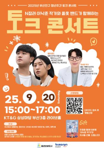 부산진구 관계자는 “이번 토크콘서트가 청년들이 음악과 이야기를 통해 서로 공감하고 힐링할 수 있는 자리가 되길 바란다”며 “청년이 주도하는 부산진구, 청년이 살기 좋은 도시라는 비전을 실현하기 위해 앞으로도 다양한 청년정책과 문화 행사를 적극 추진해 나가겠다”고 밝혔다.