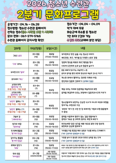 [파이낸셜경제=김예빈 기자] 화순군 청소년수련관은 지역 청소년들의 건강한 성장을 돕고 문화·여가 활동을 지원하기 위해 2026년 2분기 문화 프로그램 참가자 166명을 선착순 모집한다고 밝혔다.