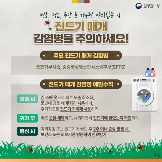진드기매개감염병을 예방하기 위해서는 ▲풀밭에 오래 앉아 있지 않기 ▲야외활동 시 긴 옷·목이 긴 양말·장갑·모자 착용하기 ▲기피제 적절히 사용하기 ▲야외활동 후에는 바로 샤워하고 진드기 여부 확인하기 ▲입었던 옷은 털어 세탁하기 등 예방수칙을 반드시 지켜야 한다.