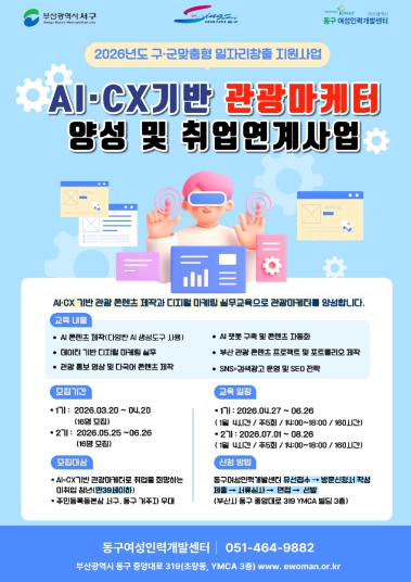 [파이낸셜경제=박영진 기자] 부산 서구와 동구가 연합하여 부산시 공모사업인 '2026년 구·군 맞춤형 일자리 창출 지원사업'에 선정돼 지역 관광산업 경쟁력 강화와 청년 일자리 창출을 위한 ‘AI·CX 기반 관광마케터 양성 및 취업연계 사업’을 추진한다.