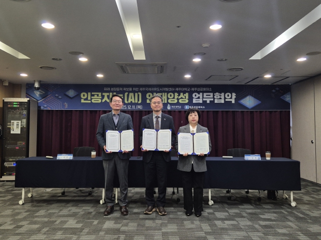 [파이낸셜경제=김영란 기자] 제주국제자유도시개발센터는 12월 11일 제주대학교, 제주상공회의소와 함께 도내 인공지능(AI) 전문인재 양성을 위한 업무협약을 체결했다.