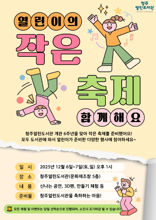 청주열린도서관 관계자는 “이번 작은 축제는 개관을 기념하고 한 해를 마무리하며, 지역 사회에 감사의 마음을 전하고자 기획했다”면서 “도서관이 지식의 공간을 넘어 지역 사회의 행복을 증진하는 문화 중심지가 될 수 있도록 행사 준비에 최선을 다하겠다”고 밝혔다.