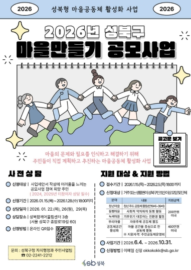 [파이낸셜경제=김예빈 기자] 서울시 성북구는 마을공동체 활성화를 위해 '2026년 성북구 마을만들기 공모사업'을 진행한다.
