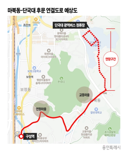 | ▲ 마북동~단국대 후문 연결도로 공사 완료시 502번 단국대 내부 연장 운행 예상 노선도 |