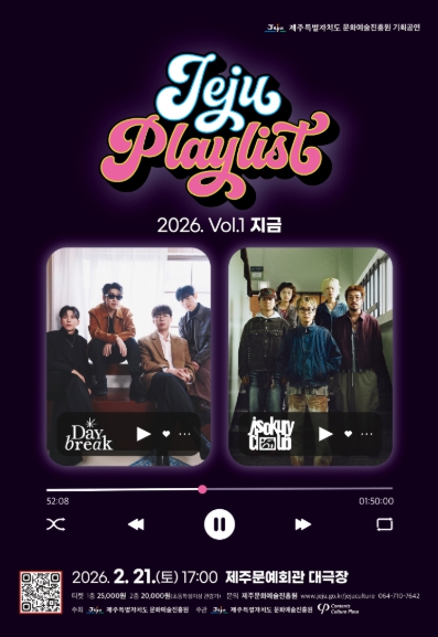 [파이낸셜경제=김영란 기자] 제주특별자치도 문화예술진흥원은 2026년 신년을 맞아 젊은 세대가 선호하는 뮤지션을 초청한 기획공연 ‘JEJU PLAYLIST 2026 VOL.1 지금’을 오는 2월 21일 오후 5시 문예회관 대극장에서 개최한다고 밝혔다.