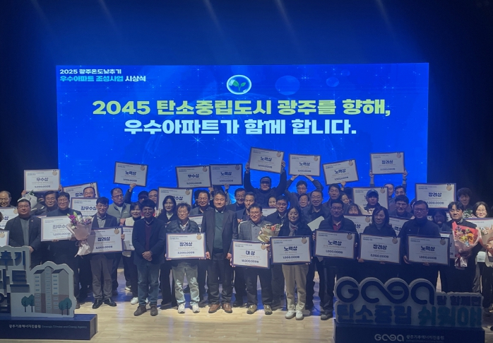 [파이낸셜경제=김예빈 기자] 광주광역시는 11일 광주디자인진흥원 이벤트홀에서 ‘2025 광주온도낮추기 우수아파트 시상식’을 열고, 탄소중립 생활 실천 활동에 참여한 우수아파트 54곳을 시상했다.