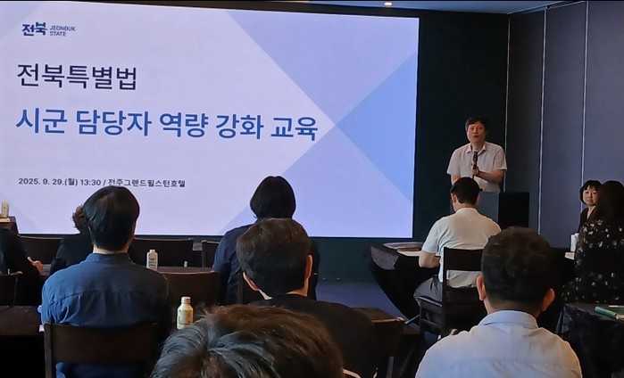 도는 29일 전주 그랜드힐스턴호텔에서 도내 14개 시군 특례 담당 공무원 50여 명이 참석한 가운데 '전북특별법 시군 담당자 역량 강화 교육'을 실시했다.