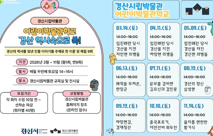 김정기 경산박물관장은 “이번 어린이 박물관학교는 단순한 역사 지식 전달을 넘어, 어린이들이 지역 역사 인물과 이야기를 통해 스스로 생각하고 탐구하는 교육 프로그램”이라며“지역 정체성과 역사 문화에 대한 긍정적 인식을 형성하는 계기가 될 것으로 기대한다”고 밝혔다.