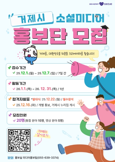 [파이낸셜경제=김예빈 기자] 거제시는 시정과 지역의 매력을 널리 알릴'제7기 거제시 소셜미디어 홍보단'을 12월 1일부터 12월 7일까지 공개 모집한다고 밝혔다.
