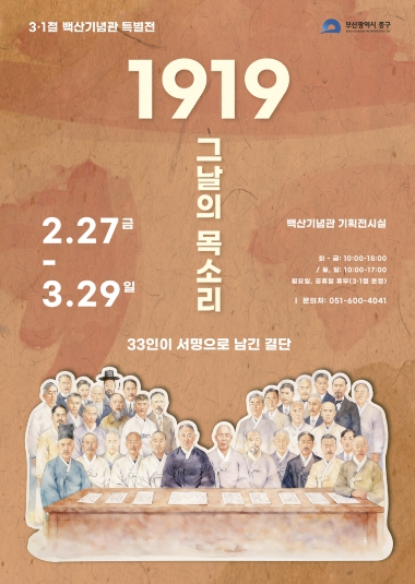 | ▲ 부산 중구, 백산기념관 제107주년 3·1절 특별전 개최 『1919 그날의 목소리, 33인이 서명으로 남긴 결단』 |