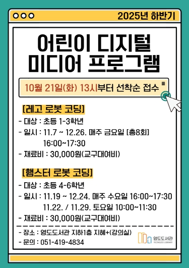 [파이낸셜경제=박영진 기자] 영도도서관에서 어린이복합문화공간의 디지털 교육환경을 기반으로 관내 어린이들의 디지털 역량 강화와 창의력 향상을 위한 ‘2025년 하반기 어린이 디지털 미디어 프로그램’을 운영한다.