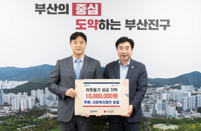 [파이낸셜경제=박영진 기자] 부산 부산진구는 9월 23일, 사회복지법인 동일(대표이사 김종각)에서 부산진구청을 방문하여 이웃돕기 성금 1,000만원을 기탁했다고 전했다.