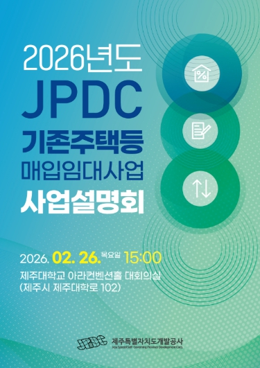 제주특별자치도개발공사(사장 백경훈)는 ‘2026년도 기존주택등 매입임대사업’의 원활한 추진과 참여 확대를 위해 오는 26일(목) 15시 제주대학교 아라컨벤션홀(제주시 제주대학로 102)에서 ‘2026년도 기존주택등 매입임대사업 사업설명회’를 개최한다고 밝혔다.