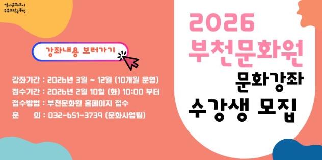 [파이낸셜경제=김기보 기자] 부천문화원이 2026년 문화강좌 수강생을 모집한다. 올해로 설립 60주년을 맞은 부천문화원은 지역문화의 기틀을 다져온 공공문화예술기관으로, 시민의 일상 속에서 역사·문화·예술의 기반을 넓혀가고 있다.