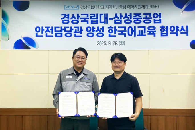 [파이낸셜경제=김예빈 기자] 경상국립대학교 RISE사업단 산학친화프로그램과 삼성중공업은 9월 29일 오후 가좌캠퍼스 언어교육실 국제교육부처장실에서 외국인 근로자의 안전한 근로환경 조성과 지역사회 정주 여건 조성을 위해 ‘외국인 근로자 대상 한국어 교육체계 구축에 관한 업무협약’을 체결했다.