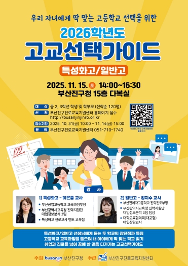 [파이낸셜경제=박영진 기자] 부산 부산진구는 11월 15일 토요일 오후 2시 구청 15층 다복실에서 ‘2026학년도 고교선택가이드 현장 설명회’를 개최한다고 밝혔다.
