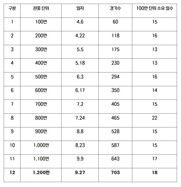 | ▲ 2025 KBO 리그 100만 단위 관중 달성 일자 |