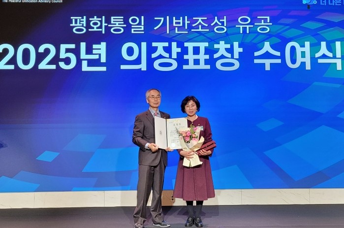 [파이낸셜경제=김지훈 기자] 민주평화통일자문회의 예천군협의회(회장 조경섭) 김재숙 자문위원은 11일 안동 스탠포드호텔에서 개최된 ‘2025년 민주평화통일자문회의 의장 표창 수여식’에서 의장(대통령) 표창을 수상했다.