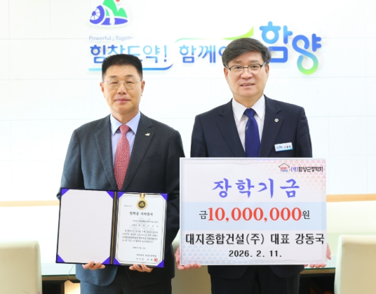 [파이낸셜경제=김예빈 기자] (재)함양군장학회는 2월 11일 대지종합건설(주) 강동국 대표가 함양군 지역 학생들을 위해 장학금 1,000만 원을 기탁했다고 밝혔다.