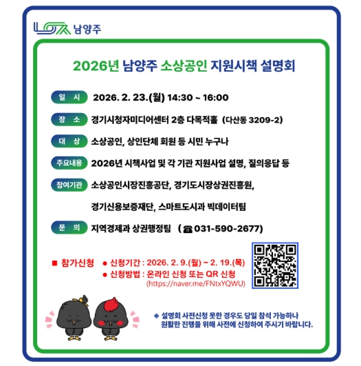 한편, 이번 설명회 참여를 희망하는 소상공인 및 상인단체는 남양주시청 누리집 메인 배너를 통해 오는 19일까지 인터넷(QR코드) 접수하면 된다.