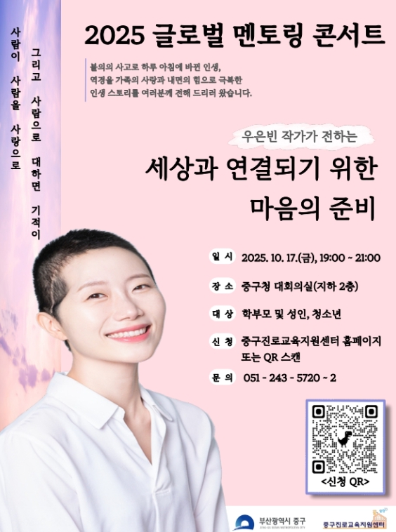 [파이낸셜경제=박영진 기자] 부산 중구는 중구 진로교육지원센터 주관으로 오는 10월 17일 오후 7시, 중구청 지하2층 대회의실에서 '2025 글로벌 멘토링 콘서트'를 개최한다.
