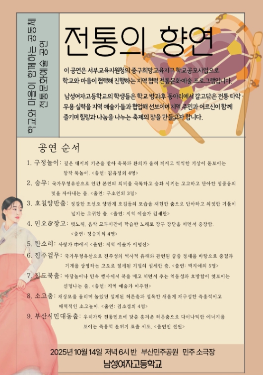이번 공연에서는 남성여자고등학교 학생들이 수업과 동아리 활동을 통해 갈고닦은 전통 타악과 무용 실력을 선보이며, 지역예술인들과 협업해 전통예술의 아름다움을 표현할 예정이다.