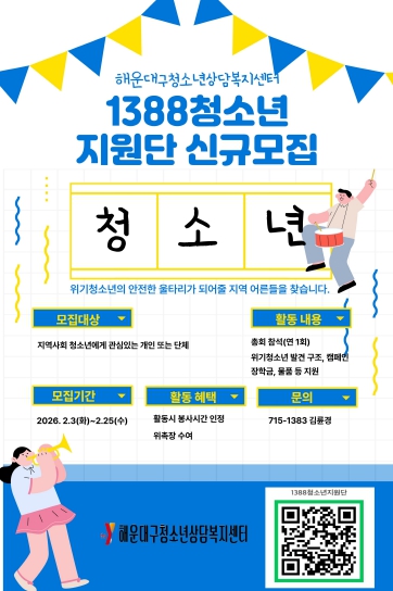 [파이낸셜경제=박영진 기자] 해운대구 청소년상담복지센터는 지역 내 위기청소년들을 조기에 발견하고 든든한 울타리가 되어줄 ‘1388청소년지원단’을 이달 25일까지 공개 모집한다고 밝혔다.