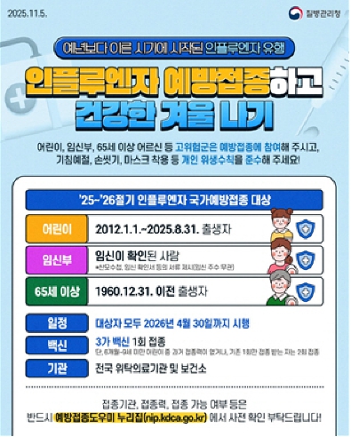 이에 따라 65세 이상 어르신뿐 아니라 생후 6개월~13세 어린이의 신속한 예방접종이 권고된다. 특히 집단생활을 하는 7~13세 학령기 어린이의 접종률이 47.2%에 그쳐 추가 접종 참여가 강조된다.