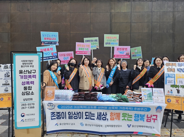[파이낸셜경제=김예빈 기자] 울산 남구는 ‘2025년 여성폭력 추방주간’을 맞아 27일 삼산 디자인거리 일대에서 울산성매매피해상담소와 울산남구가정폭력·성폭력통합상담소가 함께 ‘2025년 여성폭력 추방주간 캠페인’을 실시했다.