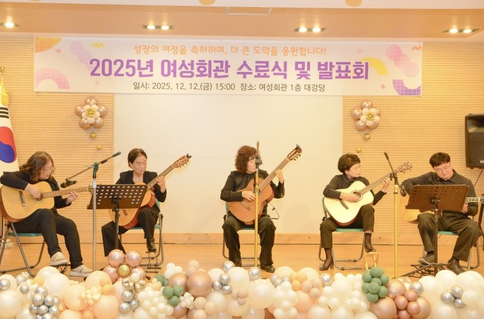 올해 여성회관 교육프로그램은 4개 분야 31개 과목을 상하반기 각 4개월씩 운영하여 568명이 수료했으며, 수료식은 그간 수료생들의 성실한 참여와 노력을 격려하는 자리로 마련됐다. 2부 발표회에서는 기타교실을 포함한 총 6개 강좌가 다채로운 공연을 선보였으며 관람객들은 수강생들의 열정과 성과를 함께 나누며 큰 호응을 보냈다.