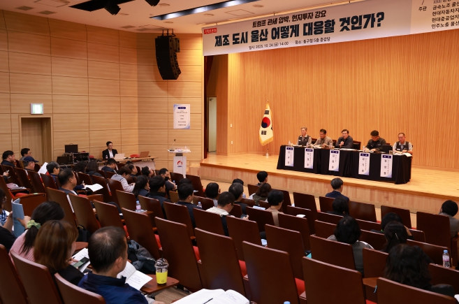 [파이낸셜경제=김예빈 기자] 울산 동구는 10월 24일 오후 2시 동구청 5층 중강당에서 ‘트럼프 정부 관세 압박과 현지 투자 강요, 제조 도시 어떻게 대응할 것인가?’란 주제로 기획토론회를 개최했다.