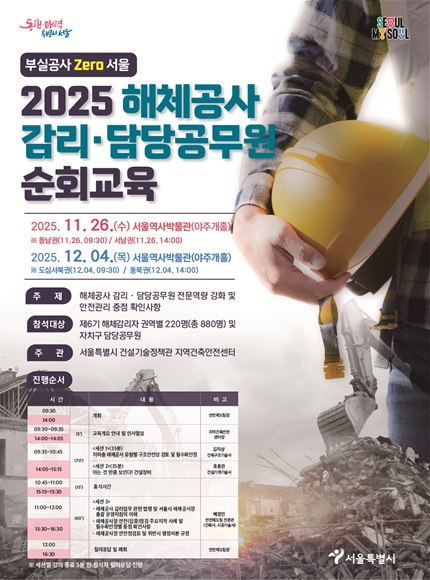 [파이낸셜경제=김예빈 기자] 서울시는 2025년 11월 26일과 12월 4일, 서울역사박물관 야주개홀에서 해체공사 감리·담당공무원 순회교육을 진행한다고 밝혔다. 해체공사 위험요인을 근본적으로 차단하기 위해 현장에서 즉시 적용 가능한 해체공사 실무 중심 역량강화 안전교육이 진행되며 제6기 해체공사 감리자 및 자치구 해체공사 인허가·상시점검 담당 공무원이 대상이다.