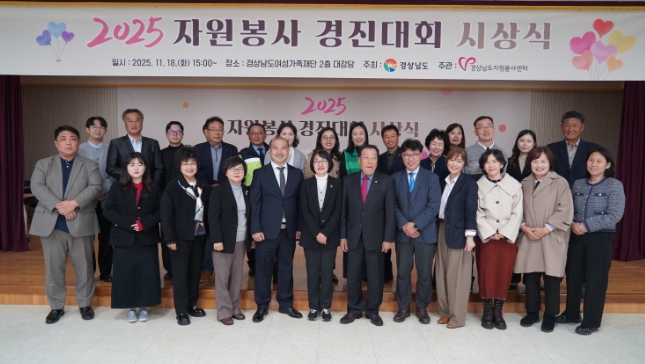 [파이낸셜경제=김예빈 기자] 경상남도는 18일 경남여성가족재단 대강당에서 ‘2025 자원봉사 경진대회 시상식’에서 지역사회 자원봉사 활성화에 기여한 29개 팀에 도지사상을 수여했다고 밝혔다.