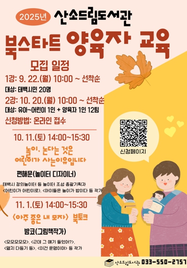 [파이낸셜경제=조성환 기자] 태백시는 산소드림도서관에서 북스타트 사업을 알리고 올바른 독서교육 방향을 제시하기 위해 “2025년 북스타트 양육자 교육”을 다음과 같이 운영한다고 밝혔다.