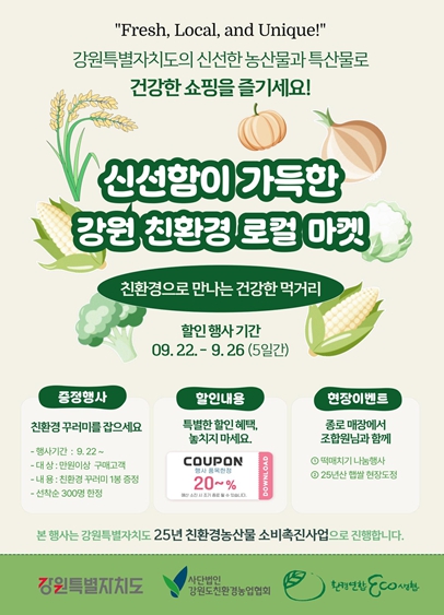[파이낸셜경제=조성환 기자] 강원특별자치도는 9월 22일부터 26일까지 5일간 두레생협 전국 111개 매장에서 '강원특별자치도 친환경 로컬마켓 2탄'을 동시에 개최한다고 밝혔다.