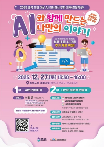 [파이낸셜경제=김기보 기자] 충청북도는 오는 12월 27일 13:30 충북도청 대회의실에서 도내 초등학생(3~6학년)과 학부모 200여명을 대상으로 ‘AI 웹툰 교육(중부권 2차)’을 진행한다고 밝혔다. 이번 교육은 북부권(충주), 남부권(옥천), 중부권 1차(청주)에 이어 2025년 마지막으로 개최되는 도내 AI 창작 체험 프로그램이다.
