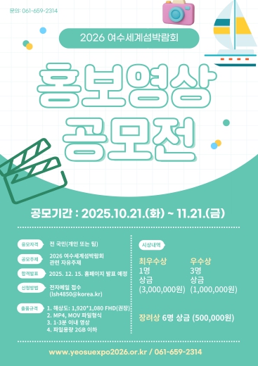 [파이낸셜경제=김예빈 기자] (재)2026여수세계섬박람회조직위원회가 11월 21일까지 ‘2026여수세계섬박람회 홍보영상 공모전’을 개최한다.