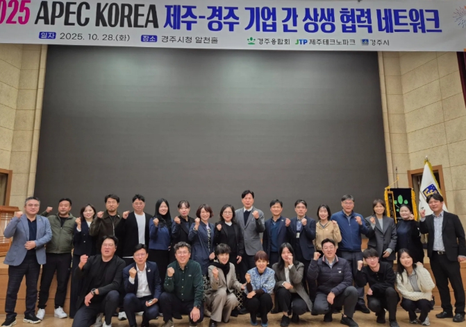 [파이낸셜경제=김영란 기자] 제주테크노파크(원장 지영흔, 제주TP)는 지난 28일 경상북도 경주시에서 열린‘2025 APEC(아시아태평양경제협력체)’ 연계 행사에서 경주시 및 사단법인 중소기업융합대구경북연합회 경주융합회(회장 김상헌)와 함께 제주·경주 기업 간 상생 협력 네트워크 회의를 개최했다고 3일 밝혔다.