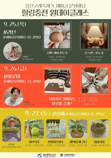 [파이낸셜경제=김예빈 기자] 남구고래문화재단(이사장 서동욱)은 9월 25일부터 27일까지 3일간 새미골 문화마당에서 ‘2025 울산고래축제’와 연계한 특별 프로그램인 ‘힐링충전 원데이클래스’를 운영한다고 밝혔다.