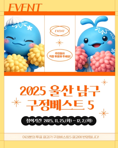[파이낸셜경제=김예빈 기자] 울산 남구는 2025년에 추진한 정책 중에서 구정 발전과 구민 삶의 질 향상에 기여하고 가시적인 성과를 거둔 정책을 구민이 직접 참여하는 설문조사를 통해 ‘구정베스트’로 선발한다고 밝혔다.
