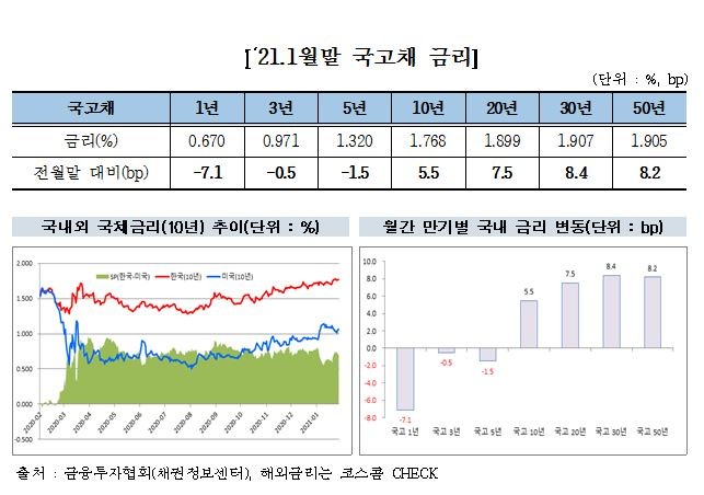 1월 국내 채권금리는 바이든 정부 출범과 대규모 경기 부양책에 따른 미 금리 상승, 4차 재난지원금과 자영업자 손실보상제 논의 등으로 수급 우려가 제기되면서 중장기 금리가 상승하였다.
