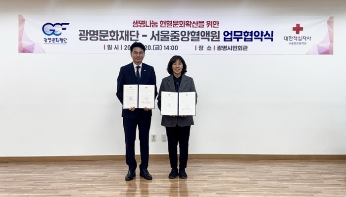 [파이낸셜경제=김기보 기자] (재)광명문화재단(대표이사 송은영)은 서울중앙혈액원(원장 이재용)과 함께 2월 20일 오후 2시에 광명시민회관에서 '헌혈자 대상 문화예술 프로그램 제공 및 헌혈 문화 정착을 위한 업무협약'을 체결했다고 밝혔다.